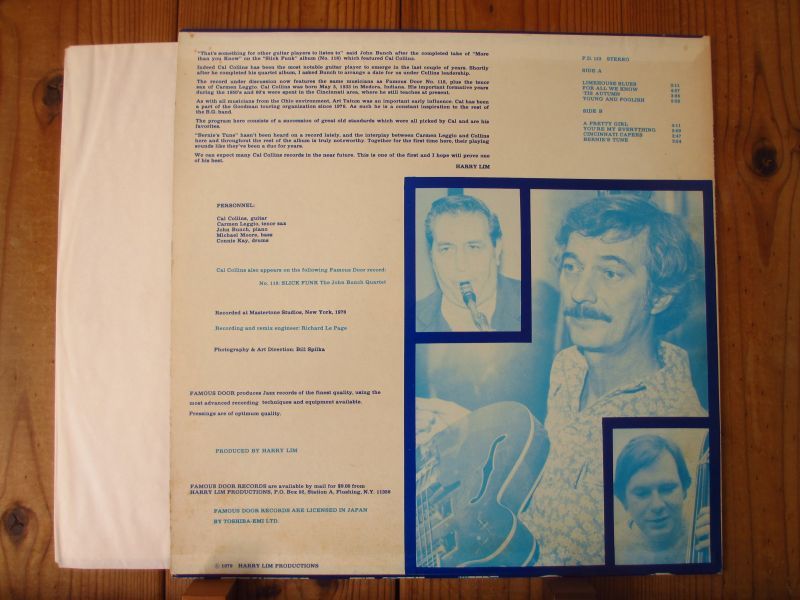 本作は、通好みのレーベル「Famous Door」に残した1978年作品。編成は、ギター、テナーサックス+ピアノトリオというクインテット編成。MJQでお馴染みのコニーケイ、ジョンバンチ、マイケルムーア等、名手がが揃い踏み。「Famous Door」というレーベル自体が、今だ未CD化も多く、本盤はカルコリンズの作品中、最も市場に出てこない一枚。