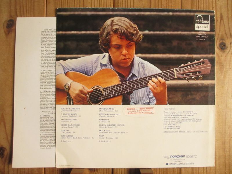 本作は、「Fontana」レーベルに残した記念すべき1stソロアルバム。希少アナログ盤。ペルナンブーコの名曲「鐘の響き」、ジャコードバンドリンの「O Voo Da Mos」、ガロートの「Vivo Sonhando」「Gracioso」、バリオスの「Choro Da Saudade」「Estudo De Concerto」、ジョビンの「Garoto」等、ブラジル〜南米を代表する先人たちの定番名曲を中心に、ギター独奏にて圧巻の演奏を披露。
