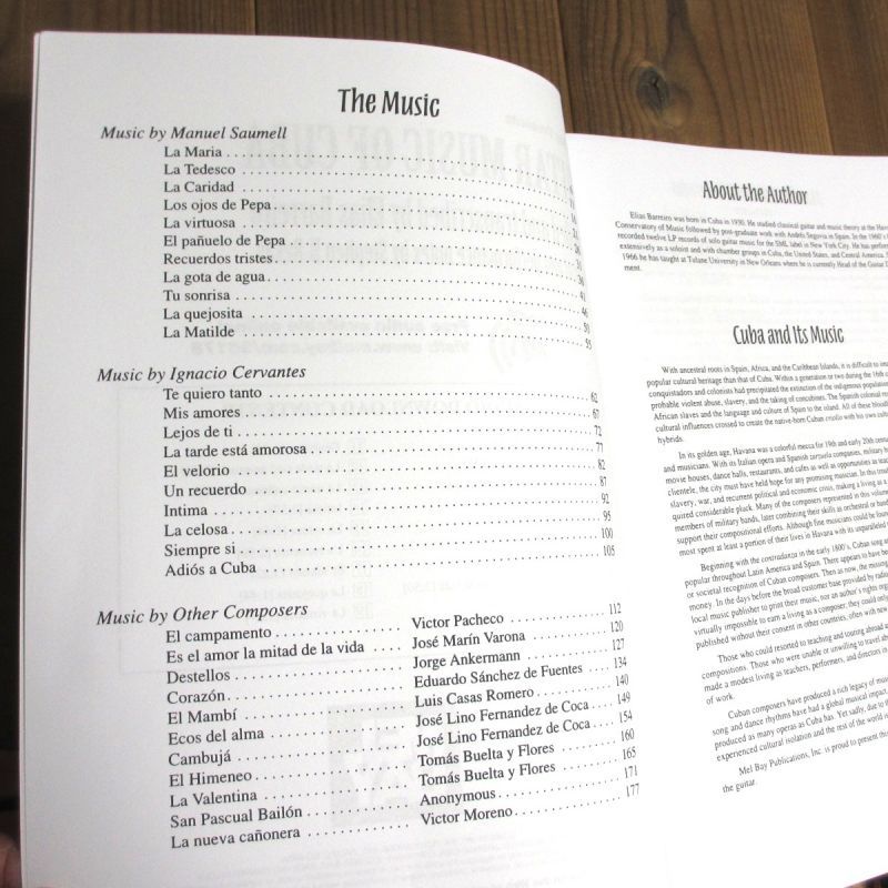 キューバの作曲家Manuel Saumellの曲を11曲、ハバナの作曲家Ignacio Cervantesを10曲、その他Jorge Akermannや、Victor Moreno等ラテン系の作曲家の楽曲を11曲。全32曲を、ギタリストElias BarreiroのアレンジによるソロギターTAB譜付ギタースコア。