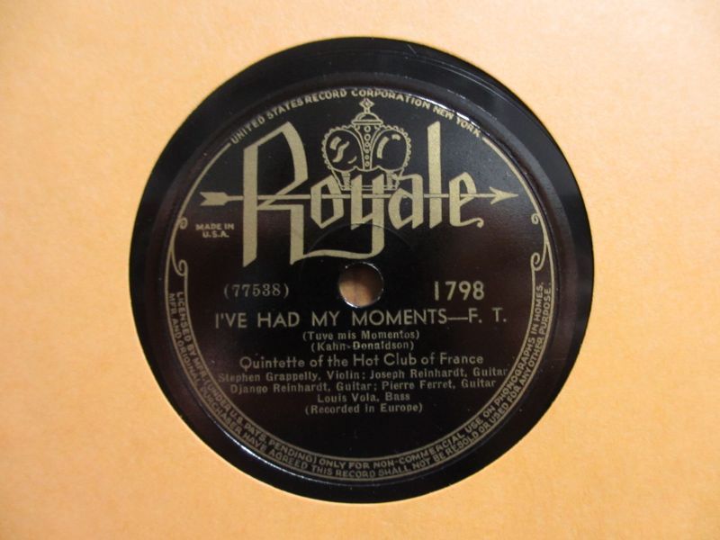 ジャンゴラインハルトとステファングラッペリ率いるフランス・ホット・クラブ五重奏団による演奏。アメリカ「Royale」レーベルの78回転SP盤。LP盤やCDでは感じることのできないジャンゴやグラッペリの鮮明な音色が聴けるSP盤ならではのド迫力の音圧が堪能できる。