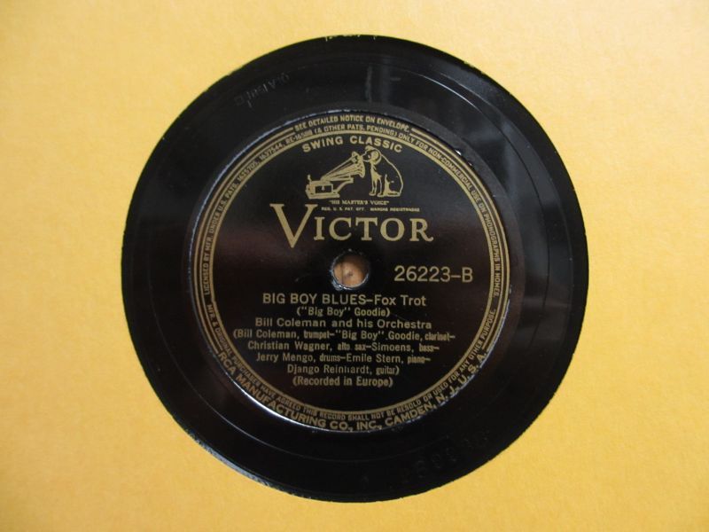 ジャンゴラインハルトとビルコールマン(tp)との共演盤。アメリカ「Victor」レーベルの78回転SP盤。LP盤やCDでは感じることのできないジャンゴの鮮明なギターの音色が聴けるSP盤ならではのド迫力の音圧が堪能できる。ビルコールマンのトランペット等管楽器がゴキゲンなスウィングジャズを披露する。「Big Boy Blues」ではジャンゴの素晴らしいギターソロが聴ける。