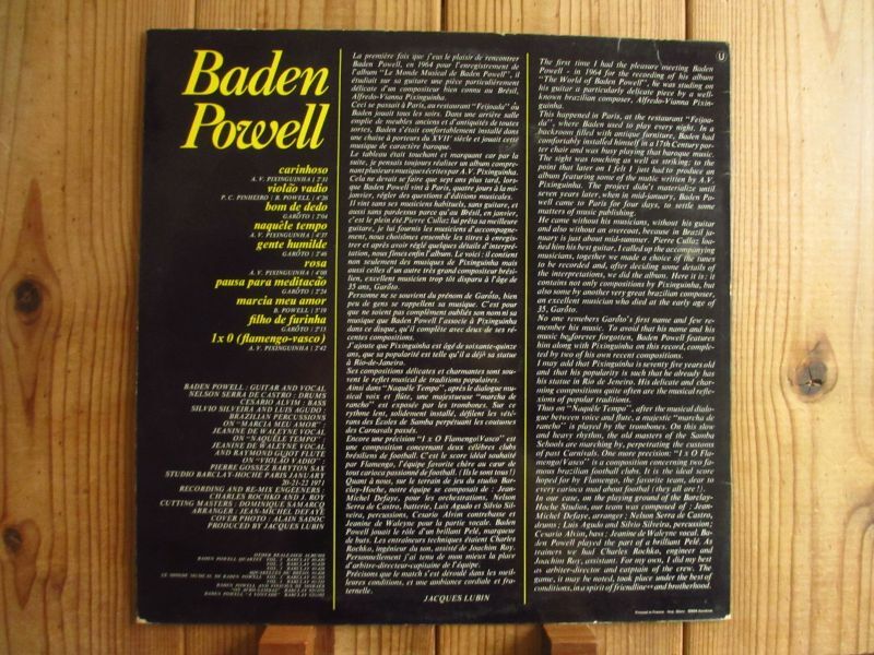 1971年パリでのスタジオ録音1972年発表作品。ガロートのカヴァーが4曲、ピシンギーニャのカヴァーが4曲収録されている。A2とB3はバーデンパウエルの作曲。彼の真骨頂である極上のソロギター名演から、Jeanine De Waleyneのコーラス入りや、ゴージャスなアレンジをバックにした楽曲まで幅広い演奏が楽しめる。バリトンサックスにPierre Gossezが参加、アレンジはJean-Michel Defayeが担当している。