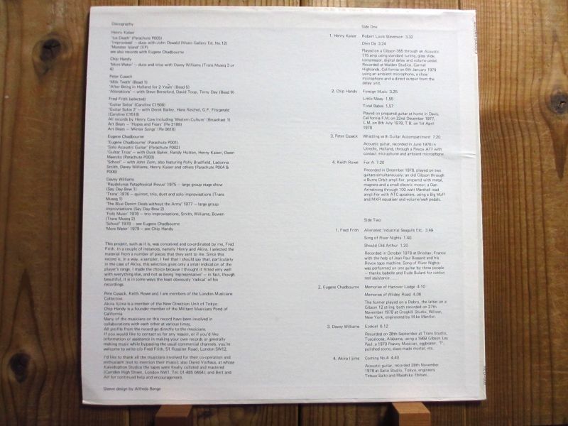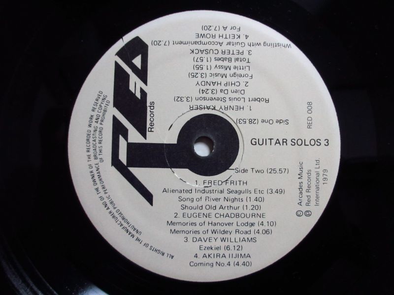 元ヘンリーカウのイギリスを代表するアヴァンギャルド〜エクスペリメンタル・ギタリスト、フレッドフリスのソロアルバム「Guitar Solos 」の続編にあたる第3弾。フレッドフリスの他に、ヘンリーカイザー、ユージンチャドバーン等のソロギター即興演奏が聴ける。