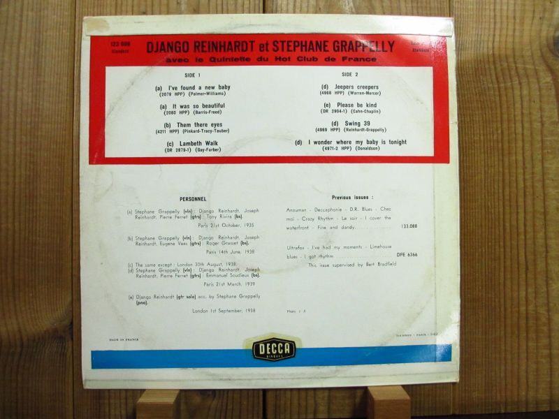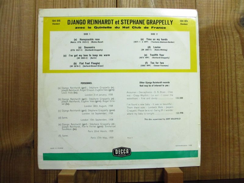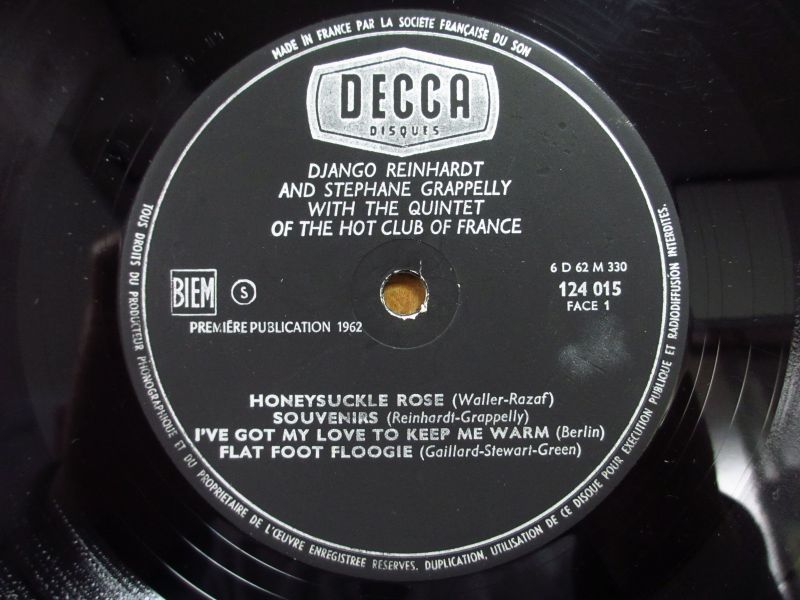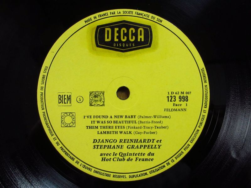 フランス「Decca」レーベルの1938年ロンドン録音と1939年パリ録音の10インチ盤2枚セット。ジャンゴラインハルトとステファングラッペリ率いるフランス・ホット・クラブ五重奏団による演奏だが、曲によってグラッペリとのデュオ等も収録されている。何れもジャンゴは電気ではなく生ギターによる録音で、素晴らしいテクニックと音色が堪能できる名作。