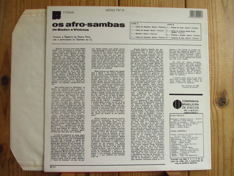 ブラジルの名門レーベル「Forma」に残した1966年録音の名作。ブラジル史上最高のギタリスト、バーデンパウエルとヴィニシウスモラエスのコラボレーション・アルバム。クアルテートエンシーのコーラスも瑞々しい歴史的名作。