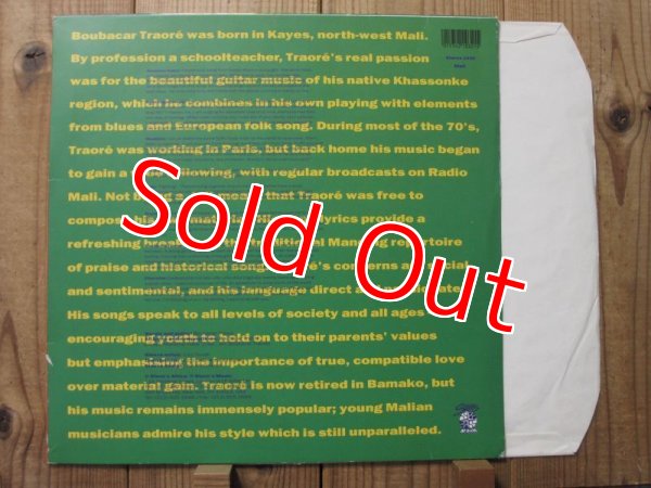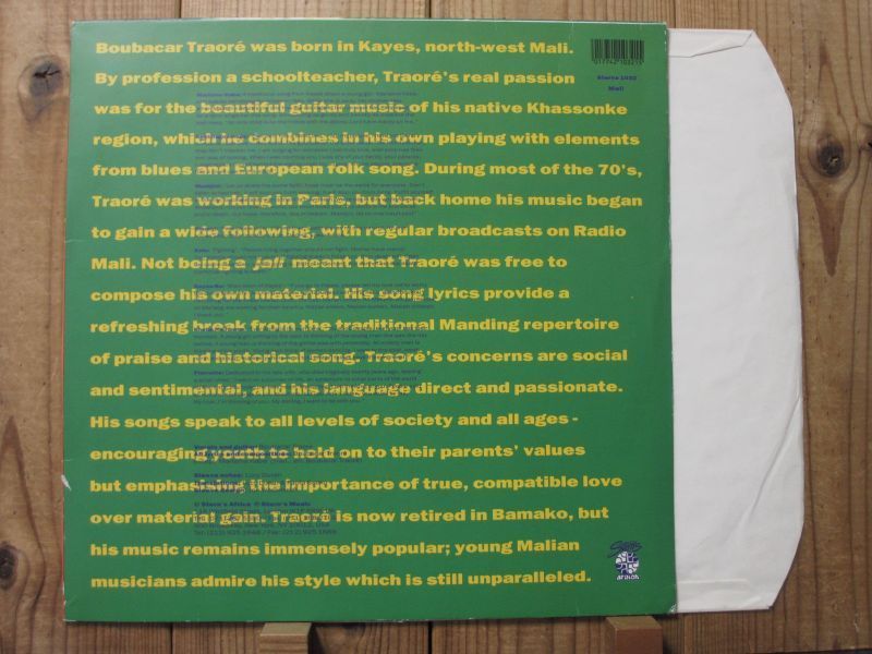 “マリ音楽の生きる伝説”ことデザートブルースの巨匠ブバカールトラオレ。1963年にレコードデビュー。マリ版ツイスト風の曲「マリツイスト」などのヒットを飛ばし、マリのチャックベリーと呼ばれ、一躍スターとなるが、1970年前後に音楽活動を一時停止。その後、1988年にブルース・ミュージシャンのように再発見され、パリを拠点に音楽シーンにカムバックしたのが、本作の1990年盤。マリ音楽とアメリカのブルースを混ぜ合わせた独自のギターと、アメリカの老ブルースマンを彷彿とさせる燻し銀の歌声。音楽大国のマリでは「最高のミュージシャンのひとり」と賞賛された。